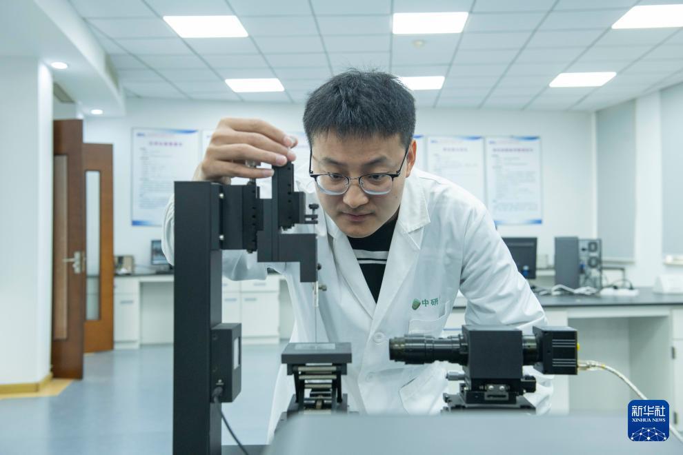 研究人員在浮法玻璃新技術國家重點實驗室利用接觸角測量儀檢測鍍膜玻璃親疏水性(11月8日攝)。