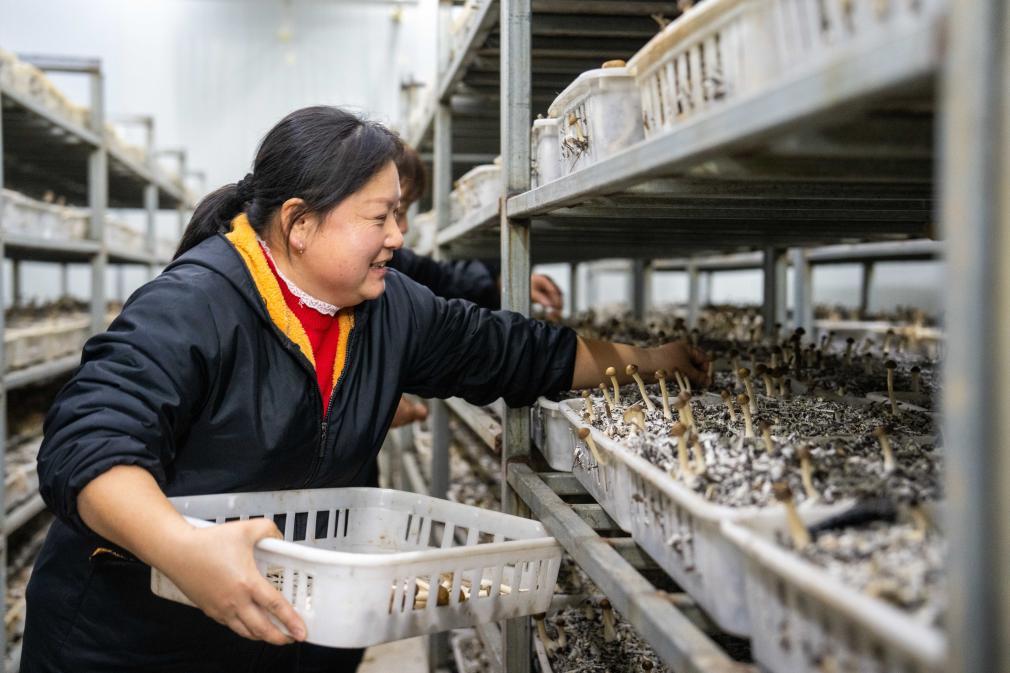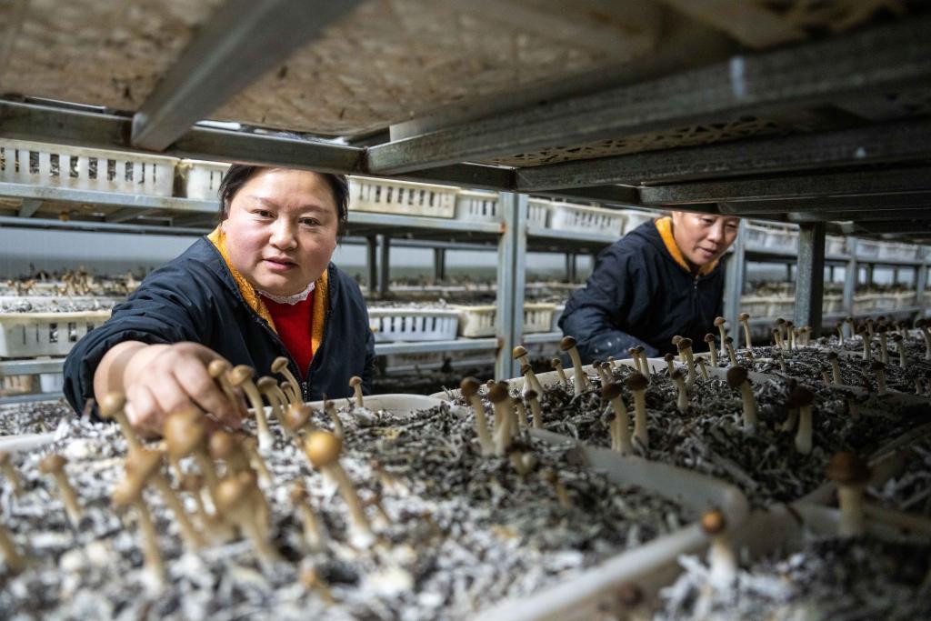 11月26日,在益陽市資陽區(qū)沙頭鎮(zhèn)富興村集體經(jīng)濟(jì)合作社基地,農(nóng)戶在采摘菌子。新華社記者阮周圍 攝