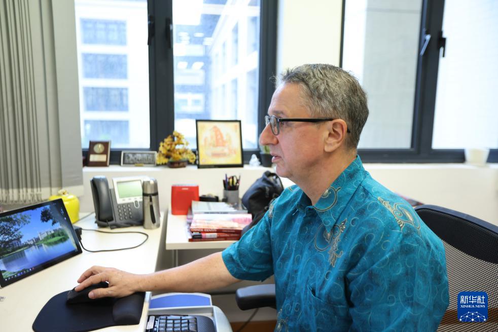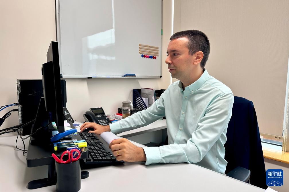 2024年11月21日,澳門城市大學葡語國家研究院的助理教授、來自葡萄牙的若昂·西蒙斯(中文名朱奧)在辦工室工作。新華社記者 王露 攝