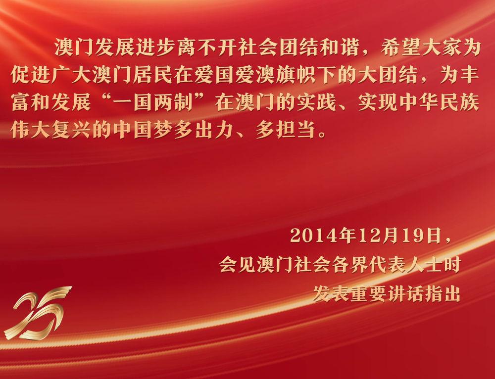 25年來(lái),澳門社會(huì)各界在愛國(guó)愛澳的旗幟下實(shí)現(xiàn)廣泛團(tuán)結(jié),愛國(guó)愛澳力量在社會(huì)政治生活中始終占據(jù)主導(dǎo),為特區(qū)政府依法有效施政、確?!耙粐?guó)兩制”在澳門成功實(shí)踐奠定了堅(jiān)實(shí)的基礎(chǔ)。