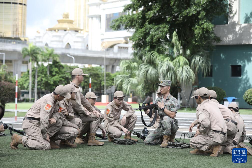 2023年7月23日,第十六屆澳門青年學生軍事夏令營在駐澳門部隊開營,教官演示武器操作使用。新華社發(fā)(陳帥 攝)