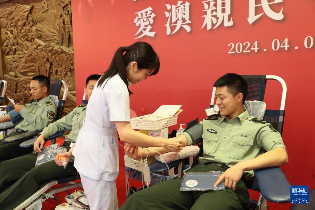 4月3日,駐澳門部隊官兵積極參加無償獻血活動。新華社發(fā)(陳帥 攝)