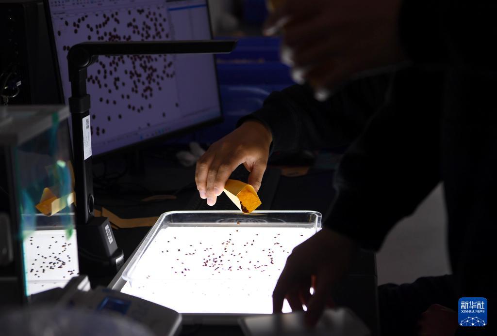 12月25日,在位于河南新鄉(xiāng)的中原農(nóng)谷實驗室,中國農(nóng)科院中原研究中心科研人員在考種儀上分析高粱種子。
