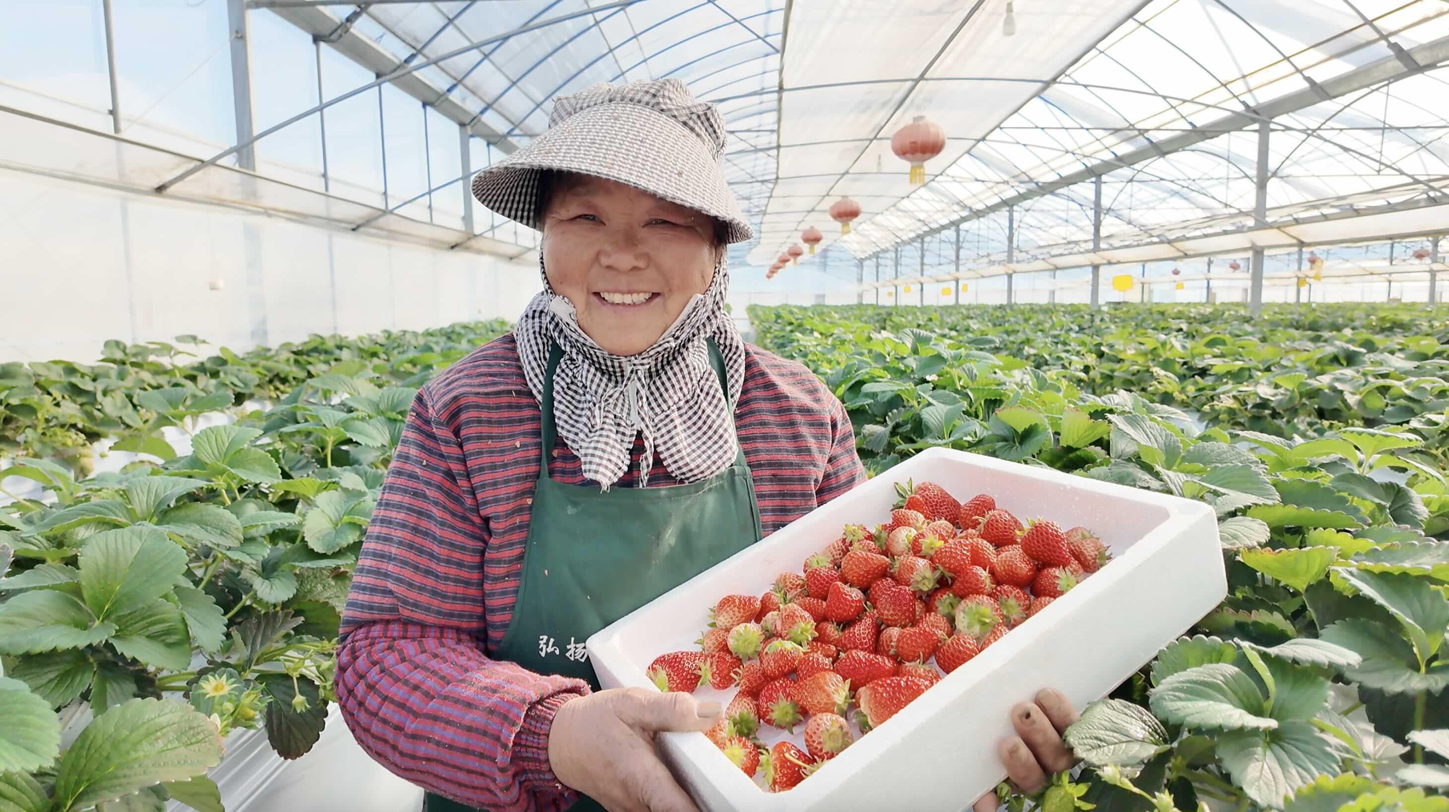 圖為世業(yè)鎮(zhèn)先鋒村村民胡春華在草莓大棚內(nèi)采摘草莓。 本網(wǎng)記者 劉遠(yuǎn)航 攝