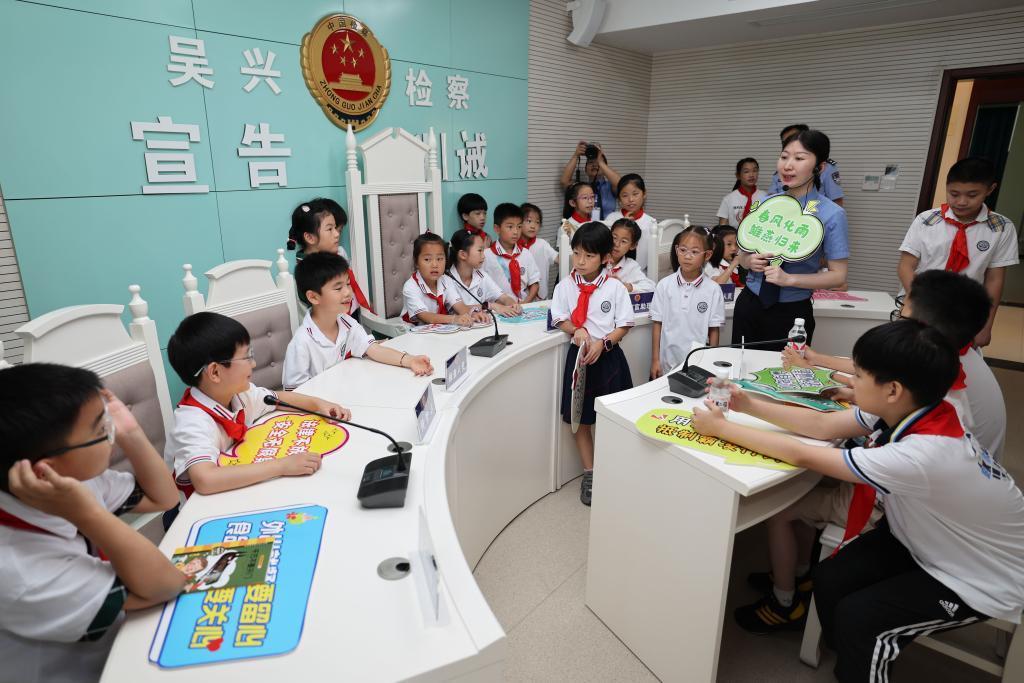 2024年7月3日,湖州市吳興區(qū)人民檢察院檢察官帶領(lǐng)小學(xué)生參觀未成年人檢察辦案區(qū)。新華社記者 黃宗治 攝