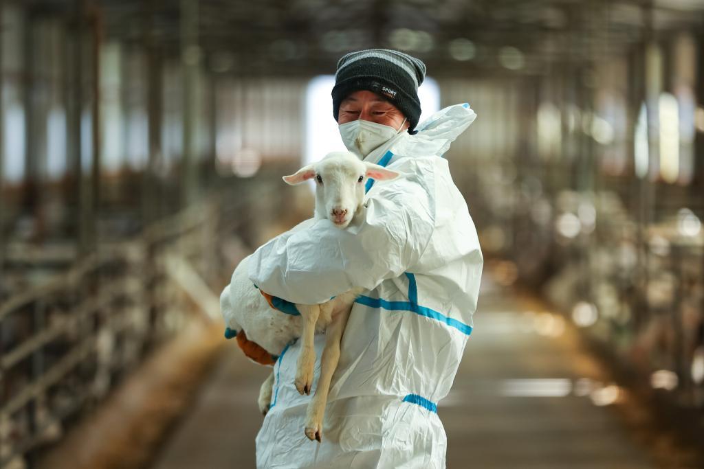 1月9日,在楊文斌的肉羊養(yǎng)殖合作社,農(nóng)民抱著新品種羊羔。新華社記者郎兵兵 攝