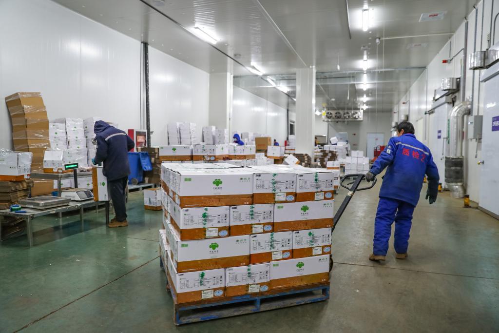 1月8日,在環(huán)縣中盛羊業(yè)加工車間,工作人員轉(zhuǎn)運羊肉準(zhǔn)備發(fā)貨。 新華社記者郎兵兵 攝