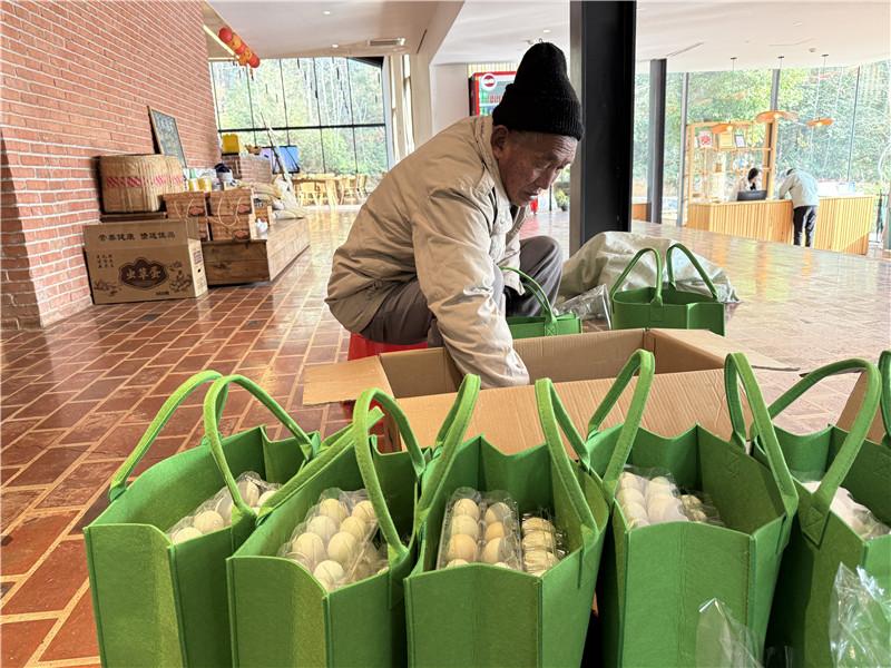 2023年,海洋村嘗試“農(nóng)業(yè)+民宿”,將村里的養(yǎng)殖的土豬、土雞制作成半成品,包裝成禮盒售賣,“去年剛開始只銷售了二十多萬元。今年的銷售情況很好,從2024年底到現(xiàn)在,已經(jīng)售賣了六十多萬元。” 馮源淵笑容滿滿,“進(jìn)入臘月后,已經(jīng)宰殺了二十多頭黑豬,還有致電想要預(yù)定的都沒有了?!?/p>