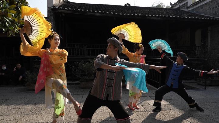 圖為1月16日秀山花燈表演者在位于重慶市秀山土家族苗族自治縣的洪安古鎮(zhèn)內(nèi)進(jìn)行表演前的排練。新華社記者 李愛(ài)斌 攝