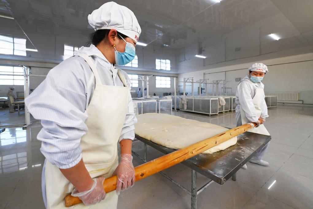 1月16日,在古浪縣泗水鎮(zhèn)的一家手工掛面生產(chǎn)車間,工人在壓面。新華社記者 范培珅 攝