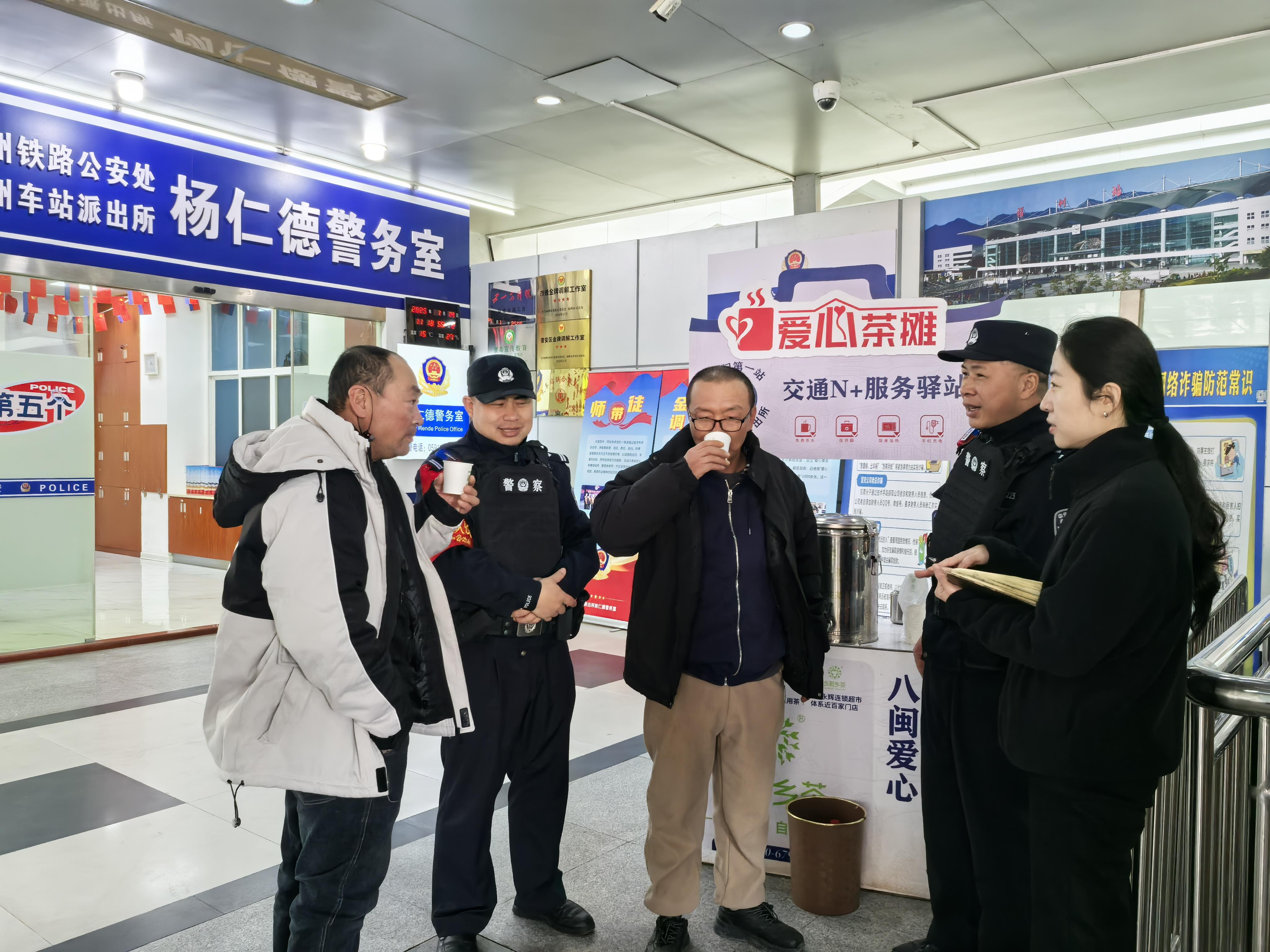 1月14日上午,在“楊仁德警務室”的“愛心茶攤”前,呂欽(左二)在師父楊仁德(右二)指導下高效解決了一起返鄉(xiāng)旅客求助。旅客們喝著熱茶,向記者(右一)稱贊福州鐵路公安的暖心服務。 本報通訊員 劉曉彬 攝
