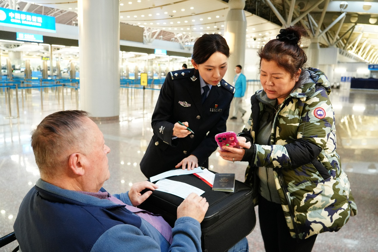 來自北京邊檢總站執(zhí)勤六大隊的杜希銘,早早站在“特別通道”前等待旅客們的到來。“特別通道”是專門為老人、兒童、殘障人士等設(shè)置,方便他們更快捷地通過??吹揭患胰送浦鴥和囎叩饺刖硻z查點,杜希銘連忙走上前去,微笑著指引著他們走“特別通道”通過。
