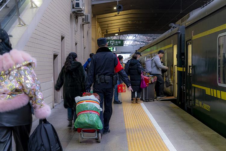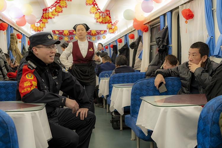 沃荻值乘的K27次列車從北京發(fā)往遼寧丹東,單次往返耗時兩天,他需要連續(xù)值乘兩個來回,共計4天。春運期間,旅客數(shù)量激增,沃荻的工作量也隨之加大?!按哼\期間旅客特別多,比平時要操心許多,我們的職責(zé)就是確保每一位旅客安全返鄉(xiāng)”。