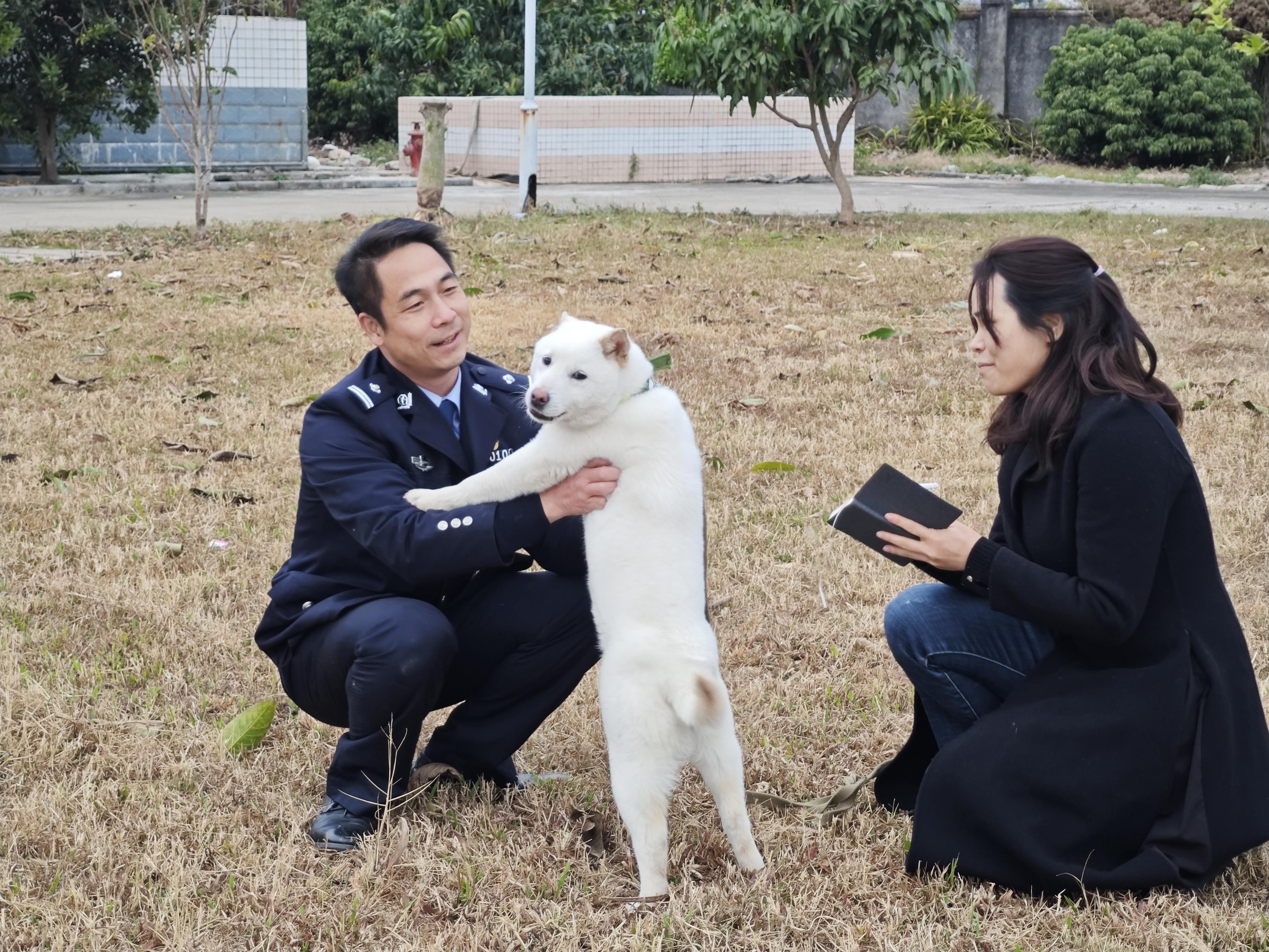 說話間,兩名訓導員帶著他們的山地警犬從犬舍中走了出來,其中一身白毛的名叫小龍女,訓導員剛一松手,它就直奔記者而來,后腿直立著把兩只前爪搭在記者的左腿上,在眾人的笑聲中,迅即跑開,撲向另一人。和小龍女的活潑不同,另一只小布丁則顯得很文靜,在記者試圖給它拍照時,它迅速躲到了訓導員羅飛亮的身后。羅飛亮蹲下身,輕輕地拍它的背,撫摸它的頭,安慰著它。