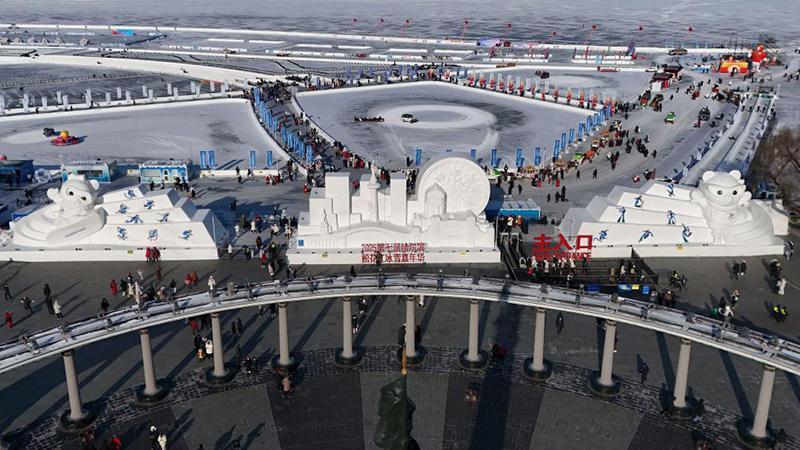 這是1月8日在哈爾濱道里區(qū)的防洪紀(jì)念塔廣場拍攝的亞冬會吉祥物雪雕“濱濱”和“妮妮”(無人機(jī)照片)。新華社記者 王松 攝