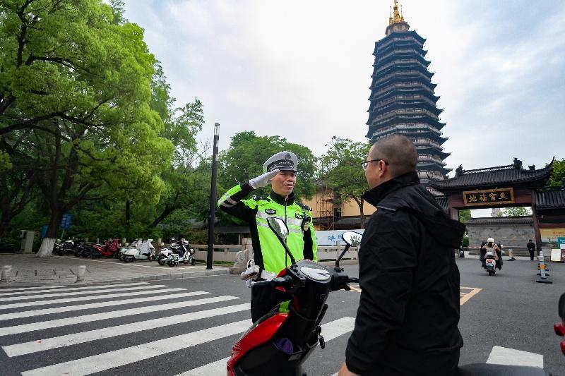 雖然戴著手套,但握著車把的粗礪手掌還是凍出了些裂口,稍微扯一扯就生疼。這是任傳棟參加常州天寧寶塔聽鐘聲迎新年安保任務(wù)的第十五個年頭,2009年工作后,每一個大年夜他都守在天寧寶塔邊的紅梅路上,15年來從不間斷。大年夜登天寧寶塔撞鐘祈福賞燈,已經(jīng)成了很多常州市民的“新年俗”,在紛至沓來卻秩序井然的車流人海背后,是常州交警數(shù)十年如一日堅守崗位的守護(hù)。