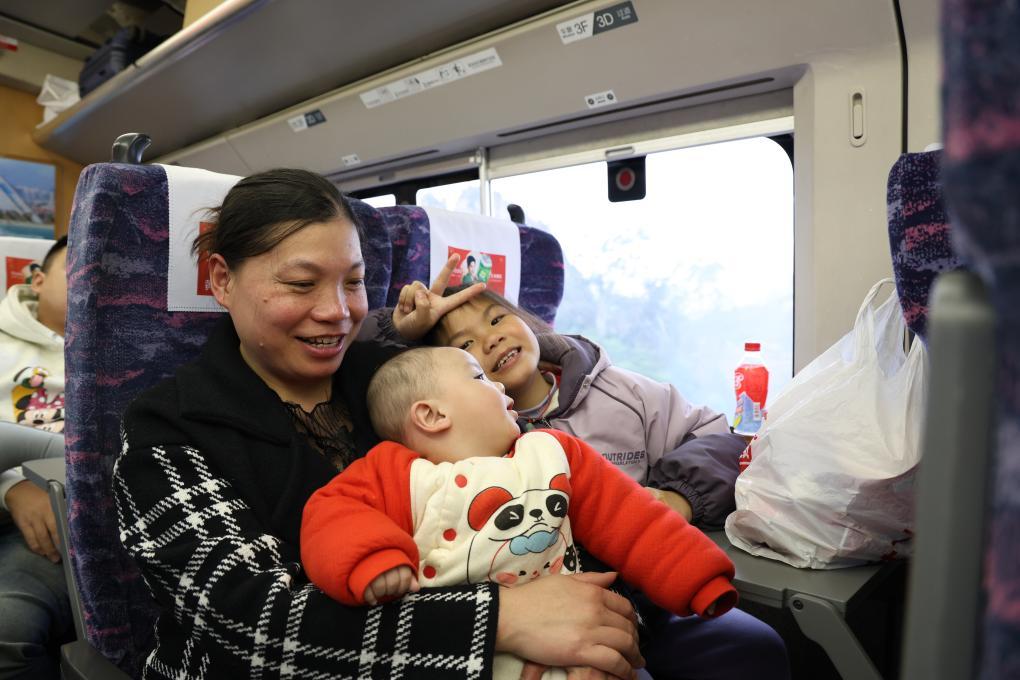 2月3日,廖秋艷與孩子在返崗專列上。新華社記者 鐘焯 攝
