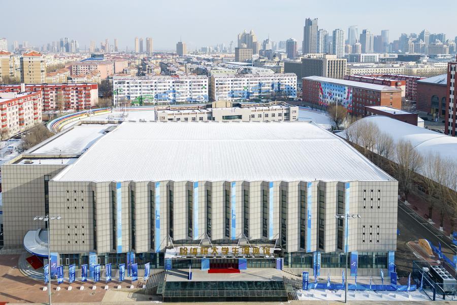 這是1月21日拍攝的哈爾濱體育學(xué)院大學(xué)生滑冰館(女子冰球比賽場(chǎng)館)(無人機(jī)照片)。新華社記者 王松 攝
