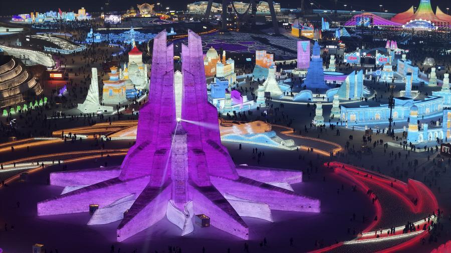 這是1月26日拍攝的第二十六屆哈爾濱冰雪大世界園區(qū)內(nèi)的第九屆亞冬會(huì)會(huì)徽冰雕,哈爾濱冰雪大世界將作為亞冬會(huì)開幕式的分會(huì)場(chǎng)(無人機(jī)照片)。新華社記者 王松 攝