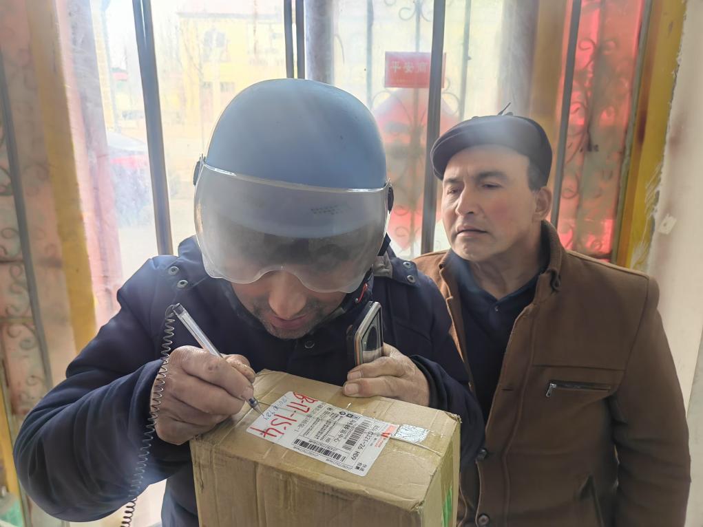 這是1月18日拍攝的新疆喀什市荒地鄉(xiāng)一快遞代收點(diǎn)顧客取快遞照片。新華社記者蔡國(guó)棟 攝