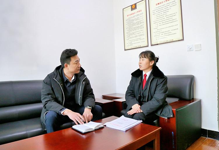 圖為記者向茹少男(右)了解大荔縣人民法院多元解紛機(jī)制。 本報(bào)通訊員 王瑞格 攝