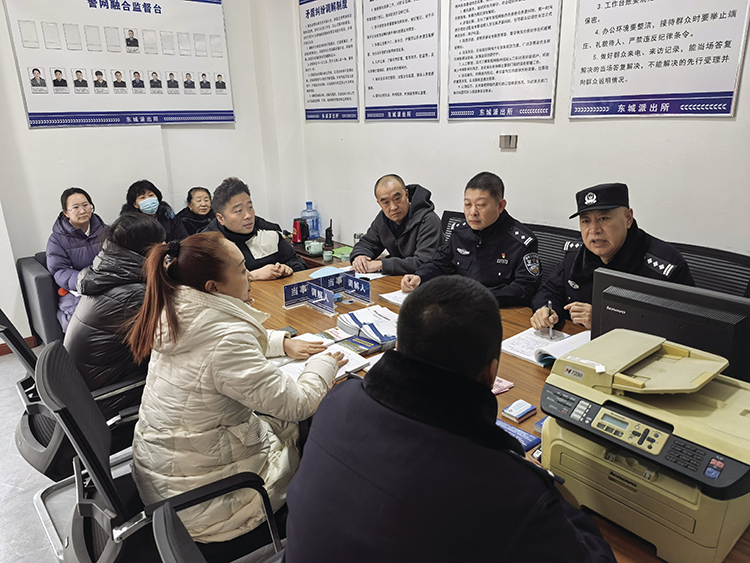 為了扎實開展春節(jié)前夕安全隱患排查整治,1月16日上午,在紫薇國際小區(qū)調(diào)解室內(nèi),李玉澤警官(右一)與社區(qū)工作人員和小區(qū)物業(yè)負責人召開“碰頭會”。