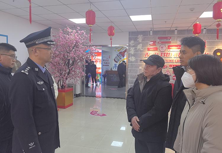 圖為《法治日報》記者(右三)在青島汽車東站采訪派出所所長王臻(著警察制服者)