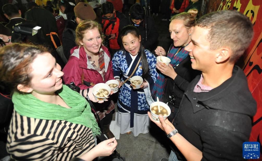 2013年2月24日,在廣西桂林陽朔西街,幾名外國游客品嘗湯圓。新華社記者 陸波岸 攝