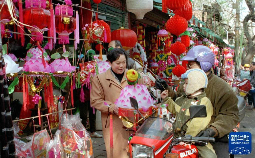 2000年元宵節(jié)前,人們在江蘇南京夫子廟廣場買花燈。 新華社記者 徐澎 攝
