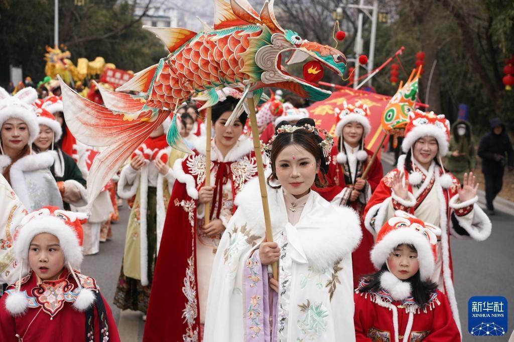 2025年2月11日,江蘇省盱眙縣舉行元宵節(jié)民俗匯演活動。這是展演隊(duì)伍在道路上巡游。新華社記者 季春鵬 攝