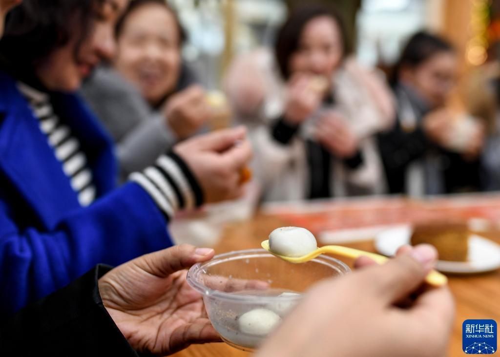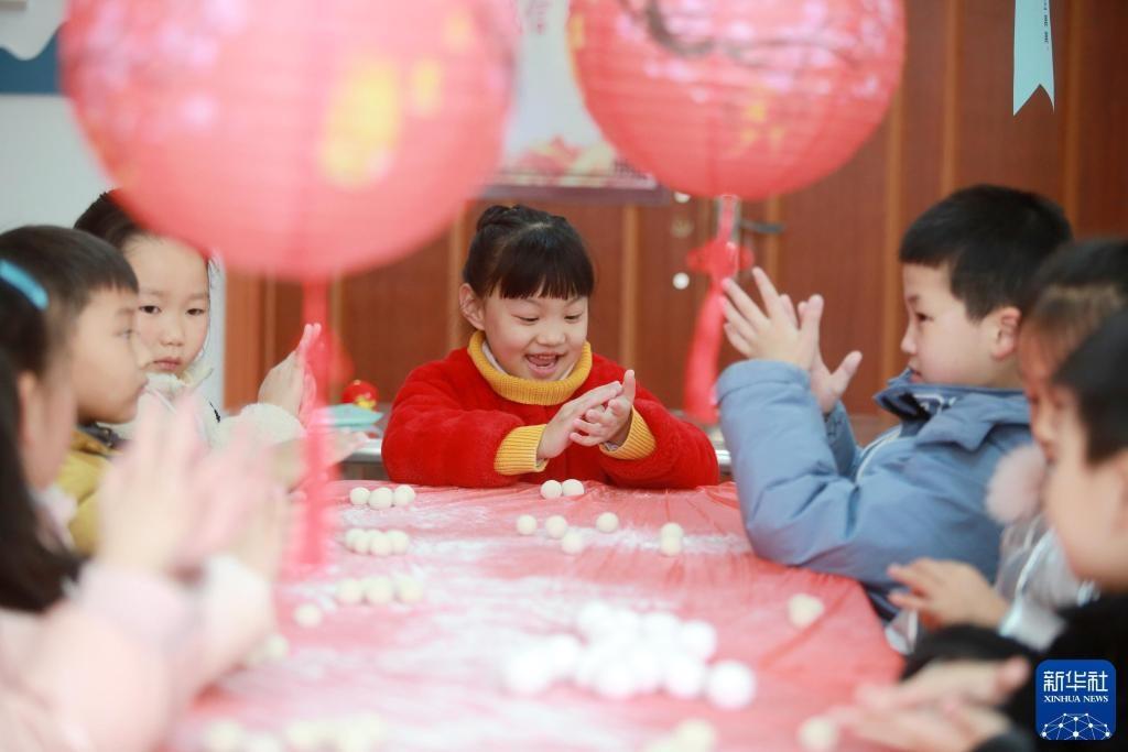 2021年2月24日,在江蘇省揚(yáng)州市杉灣花園社區(qū),小朋友動手包湯圓。新華社發(fā)(孟德龍 攝)