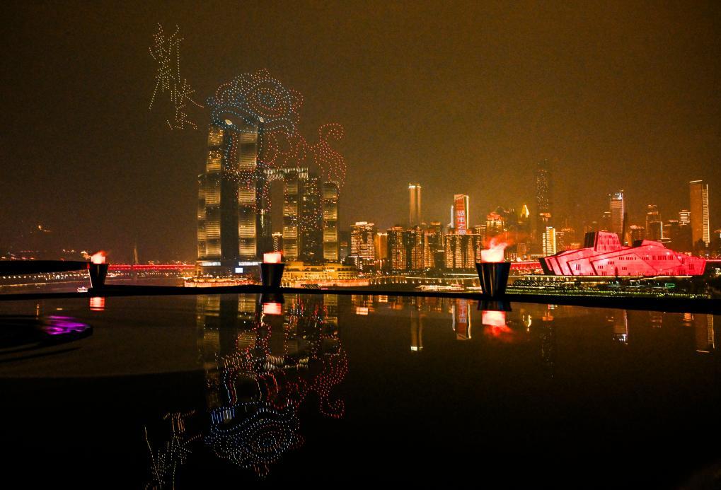 圖為在重慶拍攝的無人機(jī)表演。春節(jié)期間,多場(chǎng)無人機(jī)表演在重慶朝天門長(zhǎng)江、嘉陵江兩江交匯處精彩上演。新華社記者 王全超 攝