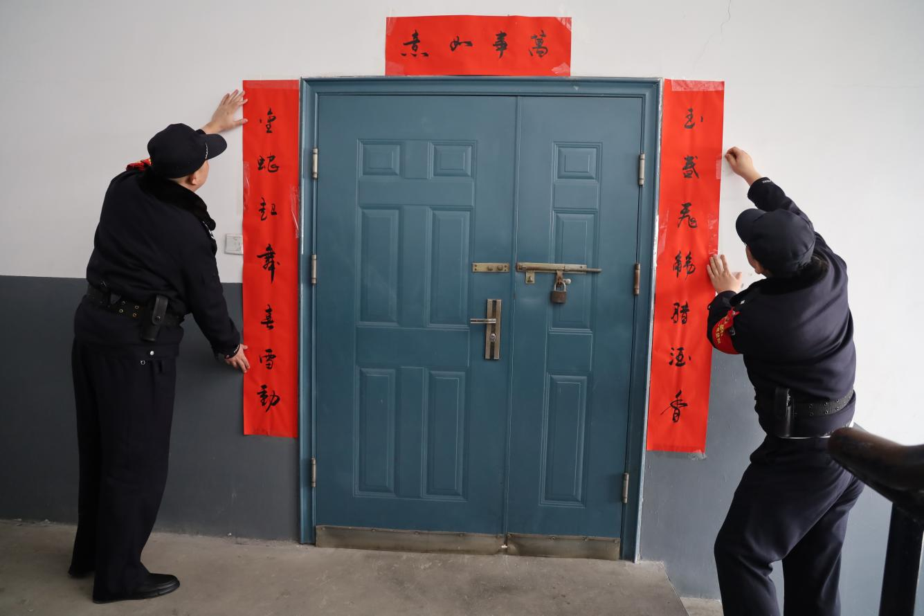 春節(jié)前夕鹿泉監(jiān)獄干警在罪犯習(xí)藝車(chē)間門(mén)口張貼春聯(lián)。