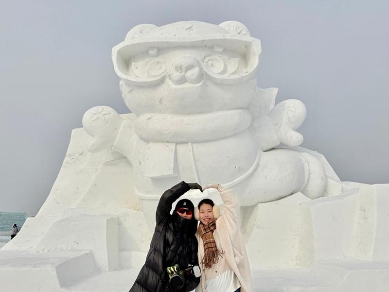 在哈爾濱冰雪大世界,來(lái)自臺(tái)灣的“95后”游客蔡湘庭正與亞冬會(huì)吉祥物“濱濱”“妮妮”的冰雕、雪雕合影?!皝?lái)這里正好趕上元宵節(jié),紅彤彤的裝飾和熱情的人們,讓我覺(jué)得非常友好。”她說(shuō)。