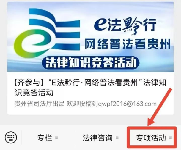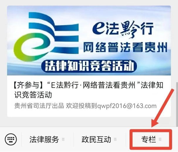 也可以進(jìn)入“貴州司法”微信公眾號(hào),點(diǎn)擊下方菜單欄“專欄”---“競(jìng)答活動(dòng)”。