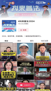抖音“抖來(lái)普法”系列活動(dòng),年度話題播放量超百億,頭部法律作者對(duì)活動(dòng)的參與率高達(dá)95%,最高法、最高檢等公檢法司政務(wù)機(jī)構(gòu)也積極參與。截至2024年12月,#抖來(lái)普法2024年度長(zhǎng)線普法系列活動(dòng),播放量134.2億次,共計(jì)上萬(wàn)名法律創(chuàng)作者發(fā)布相關(guān)內(nèi)容。系列活動(dòng)如下: