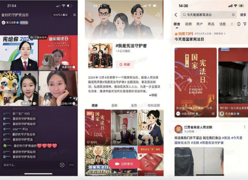 五是憲法日系列子話題持續(xù)推高活動(dòng)宣傳聲量。平臺(tái)邀請(qǐng)政法系統(tǒng)政務(wù)號(hào)、媒體、律師、學(xué)者參與#我是憲法守護(hù)者話題活動(dòng),截至目前話題累計(jì)播放量超1.5億;策劃#今天是國(guó)家憲法日#憲法的溫度#憲法日的由來(lái)#揭秘最高法憲法開(kāi)放日現(xiàn)場(chǎng)#香港海關(guān)慶祝國(guó)家憲法日10周年#香港國(guó)家憲法日升旗儀式等6個(gè)熱點(diǎn),其中#今天是國(guó)家憲法日登上抖音熱搜TOP3。