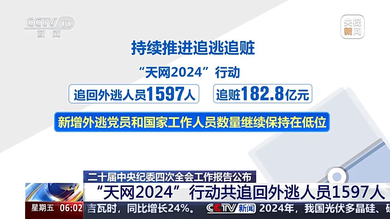 境內(nèi)打“虎”拍“蠅”,境外獵狐不停,紀(jì)檢監(jiān)察機(jī)關(guān)開展境外腐敗問題專項治理,立案查處跨境腐敗案件360件,挽回?fù)p失322億元;持續(xù)推進(jìn)追逃追贓,“天網(wǎng)2024”行動共追回外逃人員1597人,追贓182.8億元,新增外逃黨員和國家工作人員數(shù)量繼續(xù)保持在低位。