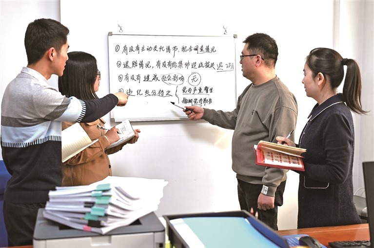 山東省萊西市紀委監(jiān)委在監(jiān)督執(zhí)紀執(zhí)法中注重統(tǒng)籌把握具體情形,準確運用“四種形態(tài)”,有效發(fā)揮層層設防的作用。圖為該市紀檢監(jiān)察干部正在研究案件,確定應該適用哪種形態(tài)處理。秦蒞博 攝