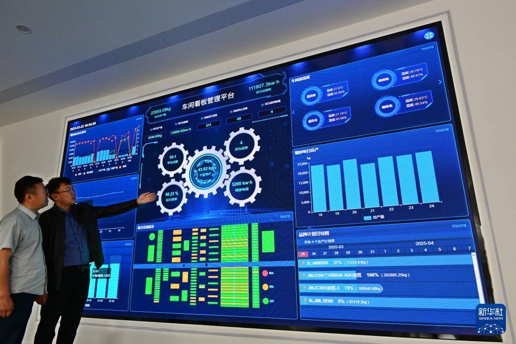 ??在即墨區(qū)龍山街道一家服裝企業(yè)的車間看板管理平臺(tái),工作人員在實(shí)時(shí)查看相關(guān)數(shù)據(jù)(3月25日攝)。