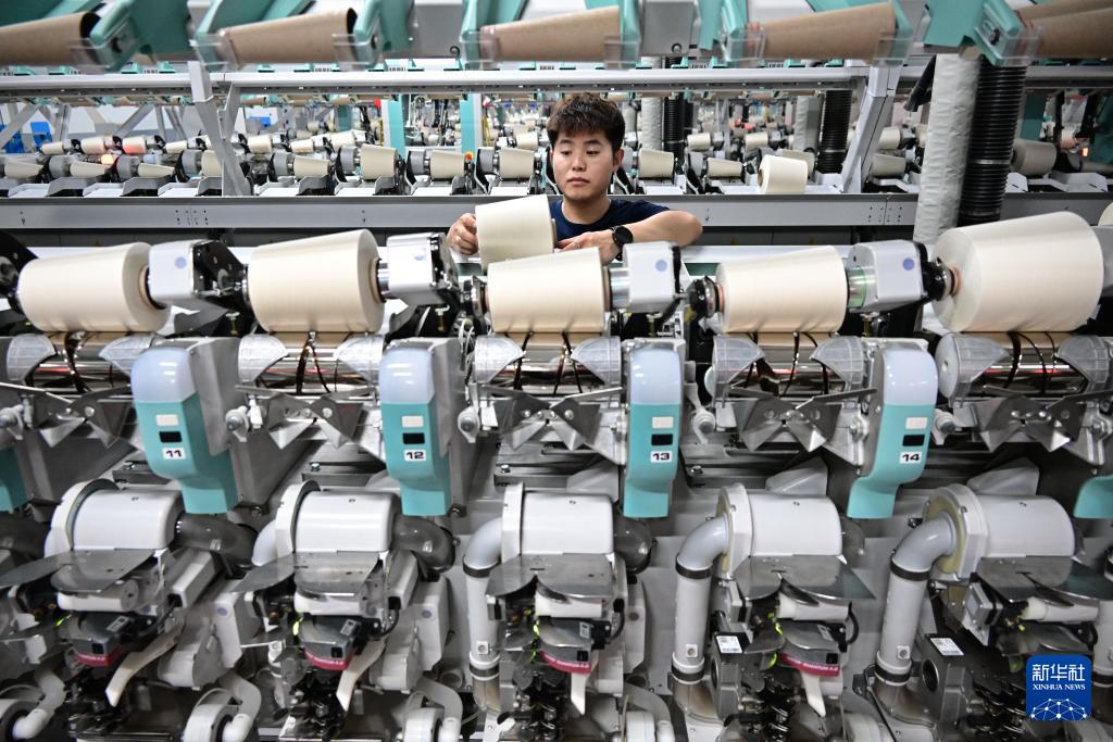 ??即墨區(qū)一家智慧紡紗企業(yè)的職工在全自動絡筒生產(chǎn)線上抽檢高端纖維品質(3月25日攝)。