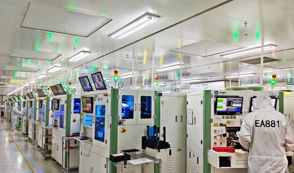 4月3日在重慶市天實(shí)精工科技有限公司無(wú)塵車間拍攝的攝像頭模組自動(dòng)化生產(chǎn)作業(yè)現(xiàn)場(chǎng)。新華社發(fā)(田浩良攝)
