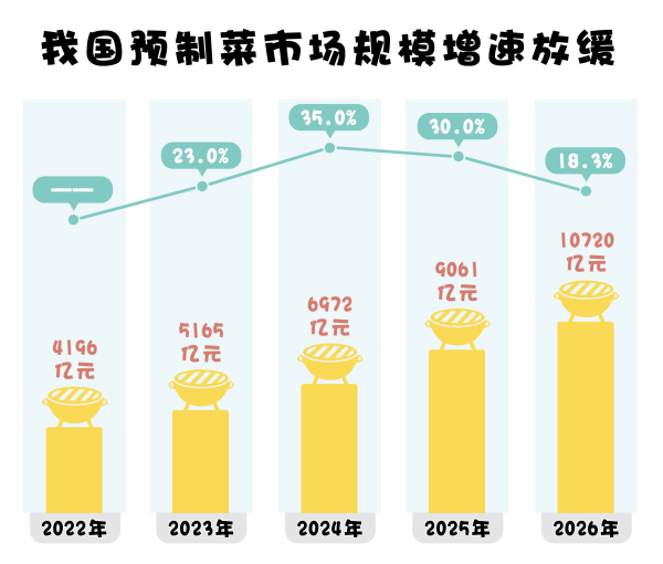 從艾媒咨詢發(fā)布的數(shù)據(jù)來看,我國預(yù)制菜市場規(guī)模呈逐年擴張趨勢,并有望在2026年突破10720億元,但是預(yù)制菜市場規(guī)模增速卻在逐步放緩。2024年,我國預(yù)制菜市場規(guī)模同比增長率為35%,而這一數(shù)字預(yù)計在2026年跌至18.3%。