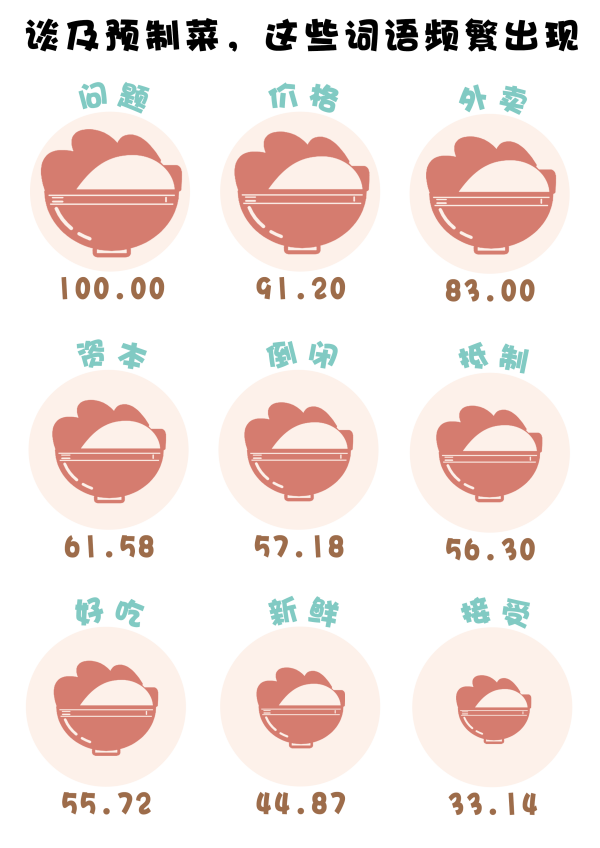 (數(shù)據(jù)來源:選取嗶哩嗶哩視頻《餐館倒閉300萬家,預(yù)制菜祭天,集體退圈的商家,人民的勝利》下的3950條一級評論及彈幕,做分詞及歸一化處理,進行分詞后將熱度最高的詞語規(guī)定為100)