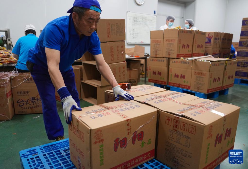 4月8日,在沈陽市陽陽食品有限公司,工人搬運(yùn)辣條。