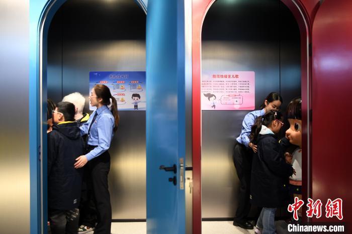 4月2日,在全國(guó)首個(gè)無(wú)障礙青少年法治教育基地,工作人員陪伴孩子在防范性侵展區(qū)了解相關(guān)知識(shí)。通過(guò)“人體紅綠燈”互動(dòng)展項(xiàng),可以增強(qiáng)孩子的自我保護(hù)意識(shí)。牛宏超供圖