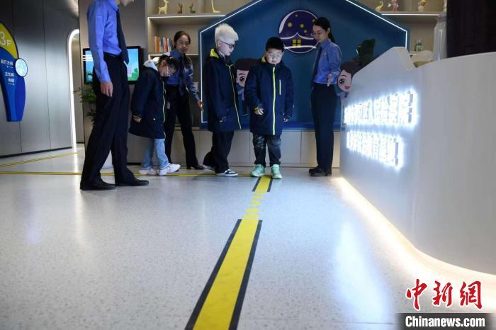 4月2日,在全國(guó)首個(gè)無(wú)障礙青少年法治教育基地,孩子們體驗(yàn)室內(nèi)盲道。牛宏超供圖