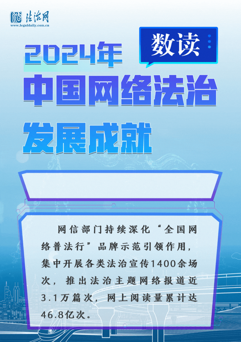 4月27日,國家互聯(lián)網(wǎng)信息辦公室發(fā)布《中國網(wǎng)絡(luò)法治發(fā)展報(bào)告(2024年)》。這是首部國家部門層面發(fā)布的網(wǎng)絡(luò)法治綜合性年度報(bào)告,既是《中國網(wǎng)絡(luò)法治三十年》報(bào)告的續(xù)篇,也是中國網(wǎng)絡(luò)法治發(fā)展年度報(bào)告的開篇。讓我們用一組數(shù)據(jù)帶你看我國網(wǎng)絡(luò)法治建設(shè)這一年的成就,感受網(wǎng)絡(luò)法治建設(shè)邁出的堅(jiān)實(shí)步伐。