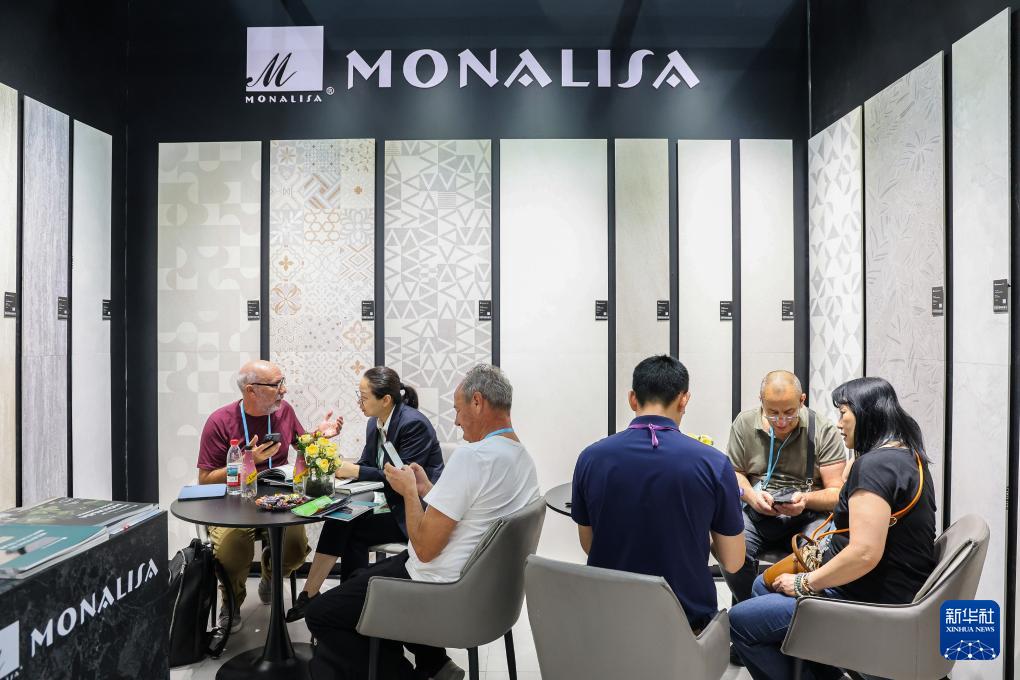 4月23日,采購(gòu)商在第137屆廣交會(huì)蒙娜麗莎陶瓷展位洽談。