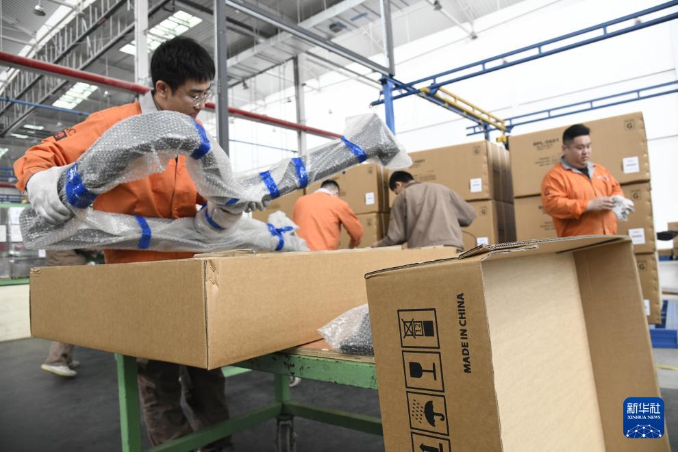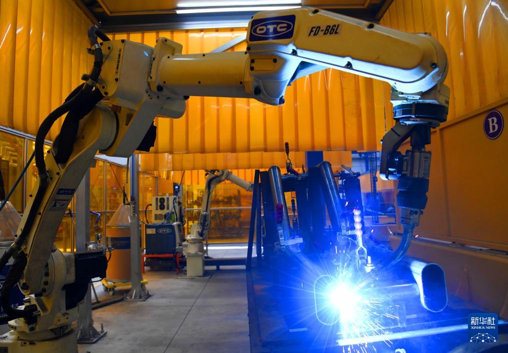 青島英派斯健康科技股份有限公司智慧工廠內(nèi)的自動激光焊接機器人在作業(yè)(4月22日攝)。